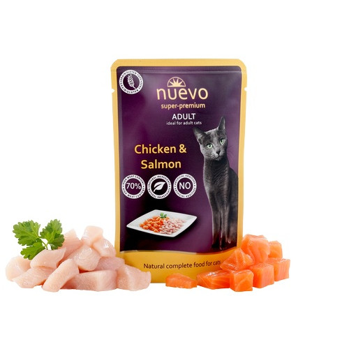 Вкусный корм для взрослых кошек Nuevo Super Premium курятина и лосось содержит 72% свежего мяса и высококачественный лососевый жир для поддержки функций иммунной системы для здоровой и активной жизни вашей кошки.