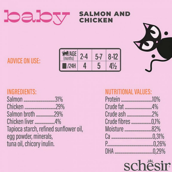 Полноценный корм с высоким содержанием белка для котят старше 2 месяцев – мягкий и бархатистый мусс из настоящего куриного мяса и лосося. 100% сбалансированные белки, витамины и минералы. Добавлен таурин. Без злаков.