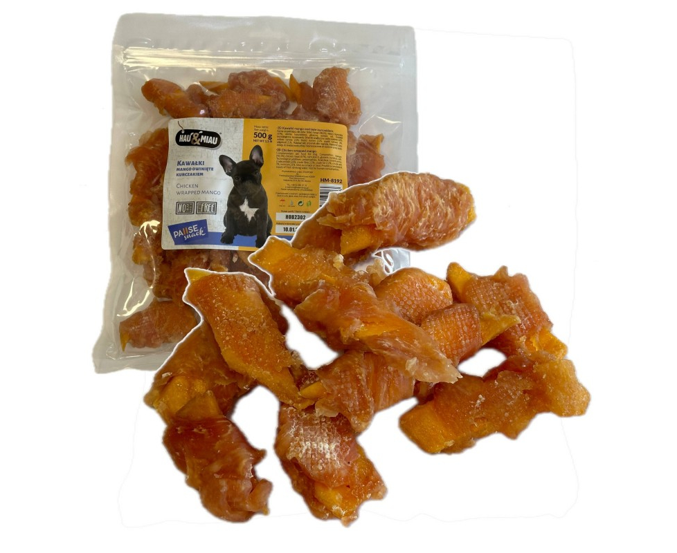 | HAU & MIAU chicken wrapped mango, 500 g - papildbarība pieaugušiem suņiem, vistas gaļā ietīti mango gabaliņi.