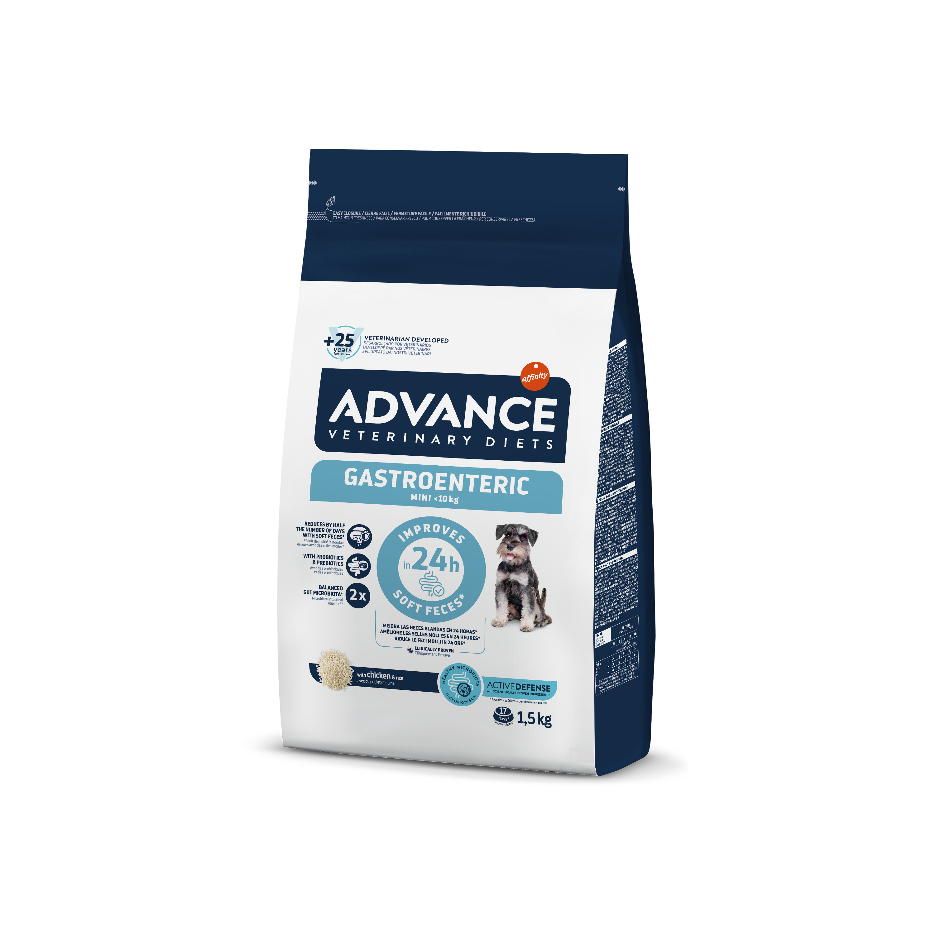 | ADVANCE VETERINARY DIETS CANINE GASTROENTERIC MINI ir viegli sagremojama, diētiska, pilnvērtīga barība pieaugušiem miniatūra izmēra suņiem un kucēniem no 14 nedēļu vecuma, kas veidota ar zemu šķiedru un augstu nātrija un kālija saturu nepietiekamas gremošanas kompensēšanai, eksokrīna aizkuņģa dziedzera mazspējas gadījumā un absorbcijas/uzsūkšanās traucējumu mazināšanai zarnās.