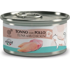 | CHEF CAT TUNA WITH CHICKEN - mitrā papildbarība pieaugušiem kaķiem, konservi ar tunci un vistas gaļu. Pagatavoti no gaļas un zivju gabaliņiem, vārīti ūdenī. Sastāvs: zivis (tuncis) 60%, dzīvnieku izc.produkti (vistas šķiņķis) 5%, rīsi. Sastāvdaļu % daudz.uz 1kg: mitrums 78.50%, kopproteīni 18.00%, kopeļļas un koptauki 0.45%, koppelni 0.50%, kopšķiedra 0.08%. Uzturfizioloģ. piedevas un mikroelem.: nav norādīti. Organolept. Tehnoloģ. piedevas: bez krāsvielam un konservantiem. Dienas devu: Pieaug.kaķim (<2 kg svara) 1-2 bundž.dienā kopā ar citu barību, lai iegūtu pilnīgu un sabalansētu uzturu. Pasniegt istabas temperat. Glabāt: neizliet.daudz.glabāt ledusskapī, izlietot 24 st.laikā. Vienmēr atstājiet dzīvn. svaigu un tīru ūdeni. Neatvērto iepak. uzglabāt vēsā un sausā vietā līdz +25°C. |