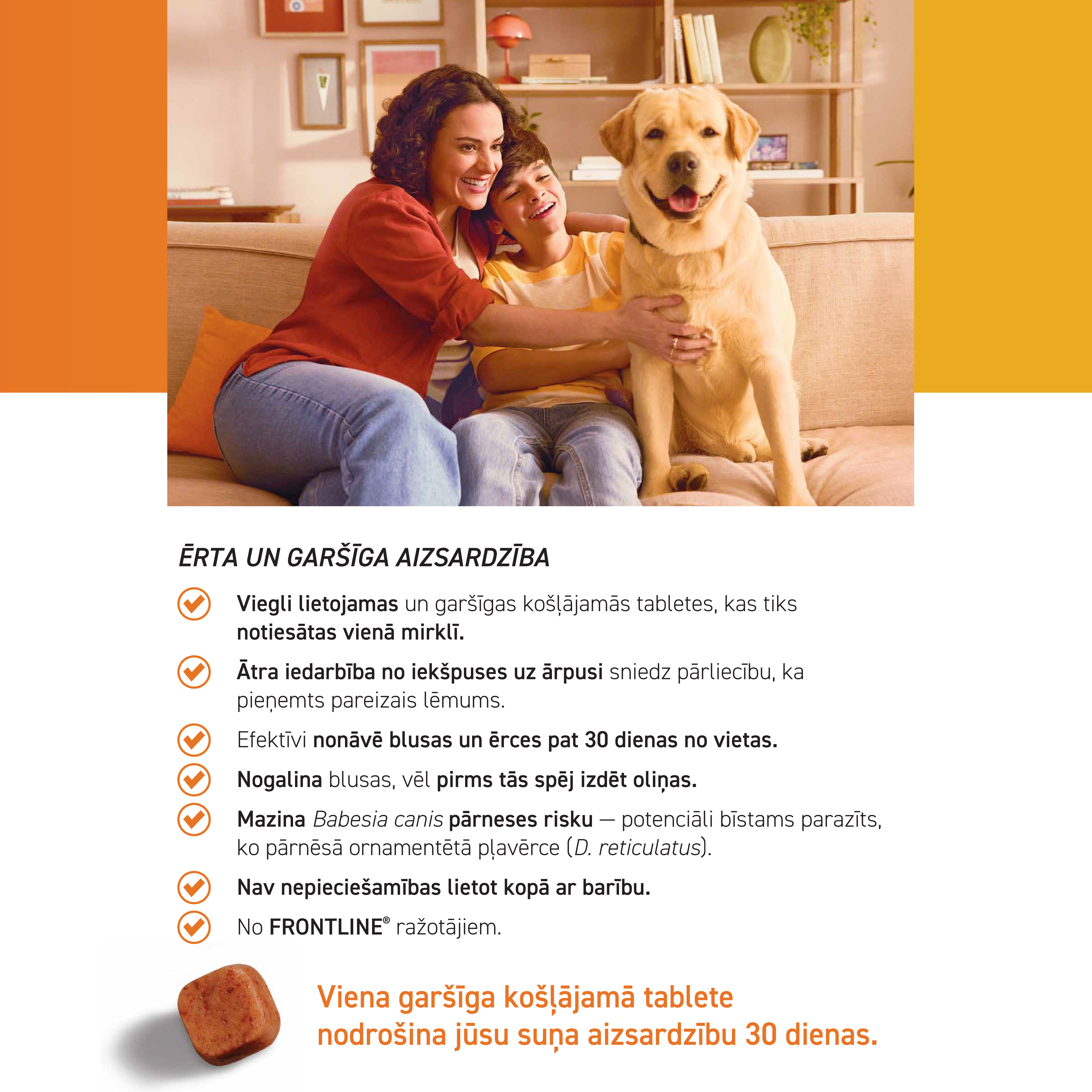 Lietošanas veids: Tabletes ir košļājamas un garšo lielākajai daļai suņu. Ja suns atsakās uzņemt tabletes tiešā veidā, tās var lietot kopā ar barību.