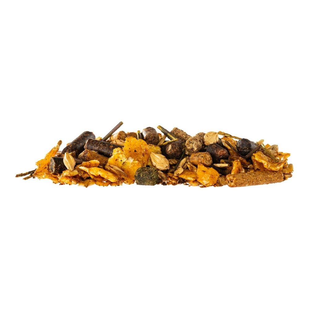 Sastāvs. Hidrotermiski apstrādātas kukurūzas pārslas 38%, hidrotermiski apstrādātas miežu pārslas 30%, kaltētas lucernas milti 10%, ābolu mīkstums 10%, melase 4.3%, kviešu klijas 2%, rafinēta augu eļļa 1.1%, linu eļļa 1%, kalcija karbonāts 1%, monokalcija fosfāts 0.5%, nātrija hlorīds 0.5%, magnija oksīds 0.2%. |
