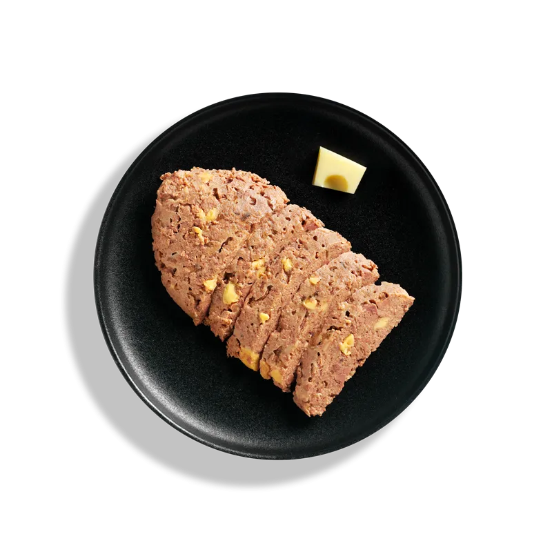 Sastāvs: pīles gaļa, sirdis, aknas, (30%),vistas gaļa, aknas, sirdis(28.5%), buljons no pīles gaļas, vistas un liellopa (28.3%),jēra plaušas (8%),siera kubiciņi (4%), minerālvielas (1%), lašu eļļa (0.2%).