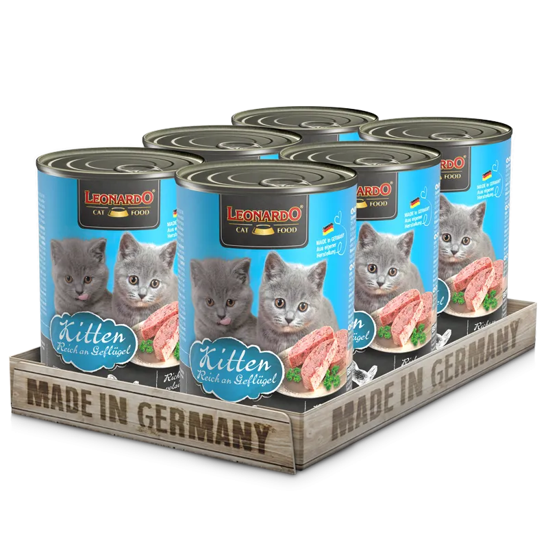 Sastāvs: mājputnu gaļa, sirdis, aknas, kuņģis (70%); Buljons mājputnu (29,1%); minerālvielas (0,5%); zivju eļļa (lasis) (0.4%) Saturs: olbaltumvielas 11,5%; Tauki 5,7%; Koppelni 2,2%; Celuloze, 0,3%; Ca,% 0,4; P,% 0,3; Piedevas / kg piedevas: vitamīns D3, 200 SV; E vitamīns, 50 mg; Zn, 20 mg; Mn, 2 mg; J, 0.2 mg; Lecitīns, 1.000 mg Barošana ieteikumus: 1 - 2 paciņas dienā. Apvienot ar sausu pārtiku Leonardo Kitten (20 g sausā uz iepakojumu)