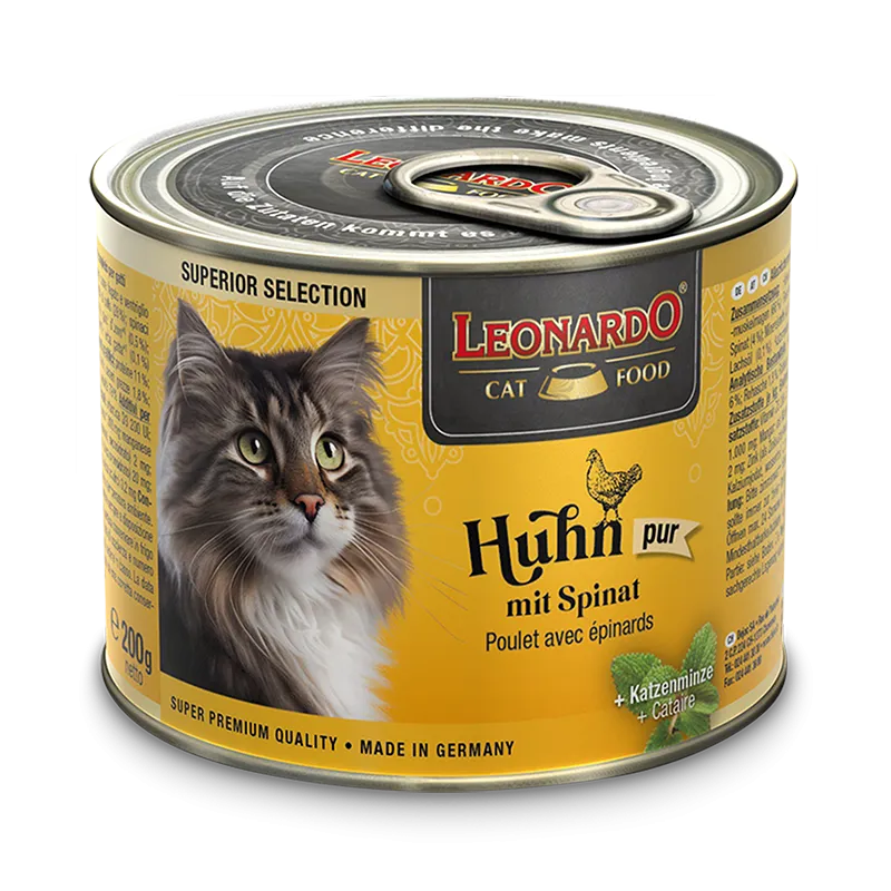 Leonardo LEO Superior Chicken with spinach 200g – pilnvērtīga barība, konservi kaķiem ar vistas gaļu un spinātiem