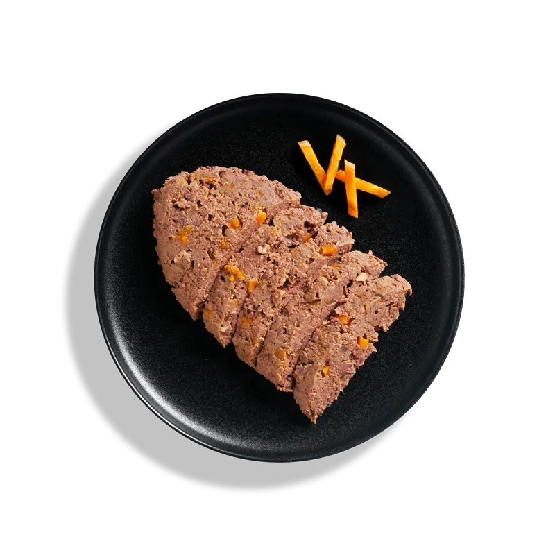 Sastāvs: teļa sirds, plaušas, nieres (36,5%); Putnu gaļa, sirds, aknas (30%); Gaļas buljons no teļiem, mājputniem (28,3%); Burkāni (4%); Olu čaumala, žāvēta (0,5%); Minerāli (0,5%); Laša eļļa (0,2%)