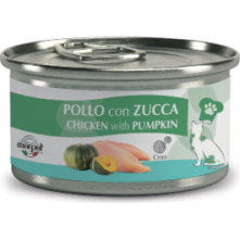 | CHEF CAT CHICKEN WITH PUMPKIN - mitrā papildbarība pieaugušiem kaķiem - konservi ar vistas gaļu un ķirbi. Pagatavoti no vistas gaļas un ķirbja gabaliņiem, vārīti ūdenī. Sastāvs: vistas gaļa 60%, produkti un blakusprodukti, pārstrādājot svaigus augļus (ķirbi) 5%, rīsi. Sastāvdaļu % daudz.uz 1kg: mitrums 79,00%, kopproteīni 18%, koptauki 0.50%, kopšķiedras 0,06%, koppelni 0,55%. Uzturfizioloģ. piedevas un mikroelem.: nav norādīti. Organolept., Tehnoloģ. piedevas: bez krāsvielam un konservantiem. Dienas devu: Pieaug.kaķim (<2 kg svara) 1-2 bundžiņas dienā kopā ar citu barību, lai iegūtu pilnīgu un sabalansētu uzturu. Pasniegt istabas temperatūrā. Glabāt: neizlietotu daudzumu glabāt ledusskapī, izlietot 24 st.laikā. Vienmēr atstājiet dzīvniekam svaigu un tīru ūdeni. Neatvērto iepak. uzglabāt vēsā un sausā vietā līdz +25°C. |