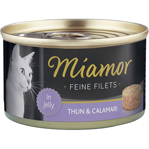 MIAMOR Feine Fillets Thun & Calamari 185g – konservi kaķiem ar tunča filejas un kalmāru gabaliņiem želejā.