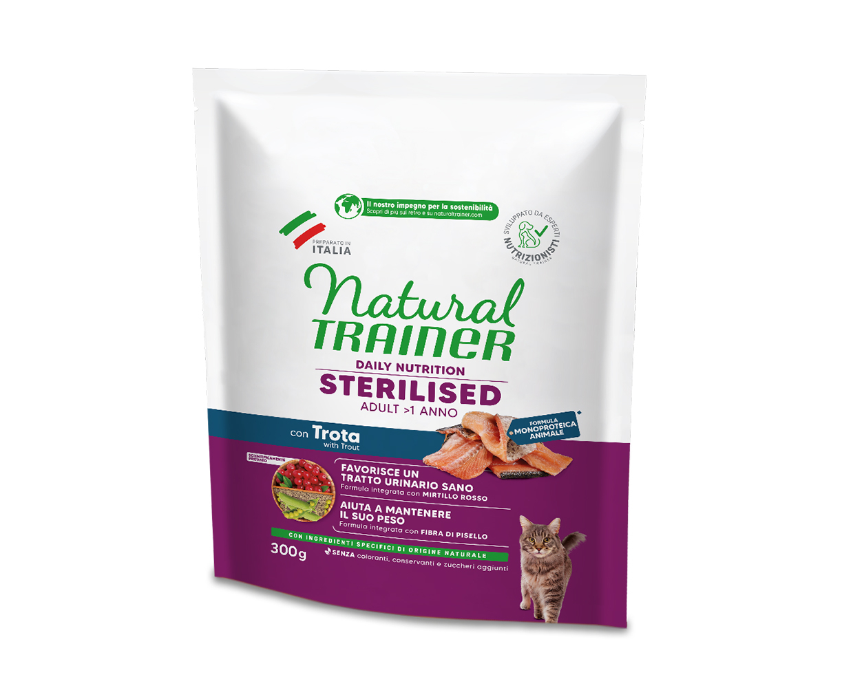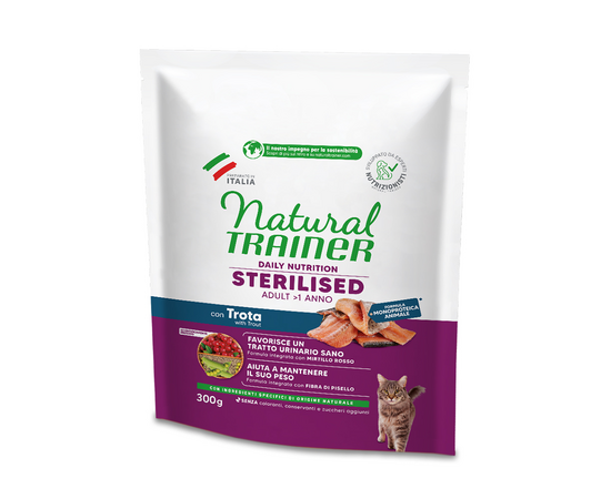 NATURAL TRAINER CAT ADULT STERILIZED WITH TROUT 300gr — ДЛЯ ВЗРОСЛЫХ СТЕРИЛИЗОВАННЫХ КОШЕК, С ФОРЕЛЬЮ