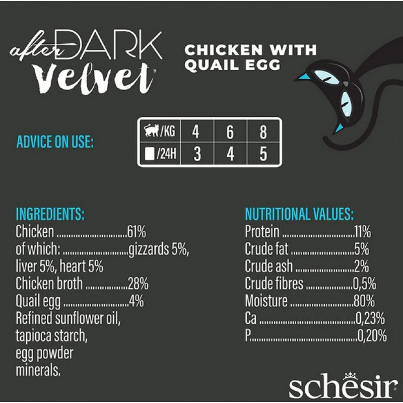 Pilnvērtīgā, ar augstu proteīna saturu, barība pieaugušiem kaķiem – maigs uzputenis, sakults no īstās vistas filejas, kopā ar garšīgām un barojošām sirdīm, aknām un kuņģīšiem, kā arī gardām paipalu olām. 100% sabalansēti proteīni, vitamīni un minerāli. Bez graudiem.