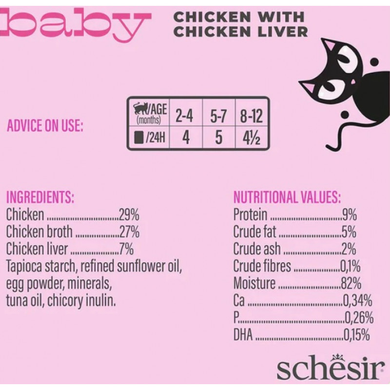 Pilnvērtīgā, ar augstu proteīna saturu, barība kaķēniem pēc 2 mēn. – mīksts un samtains uzputenis no īstas vistas gaļas. 100% sabalansēti proteīni, vitamīni un minerāli. Pievienots taurīns. Bez graudiem.
