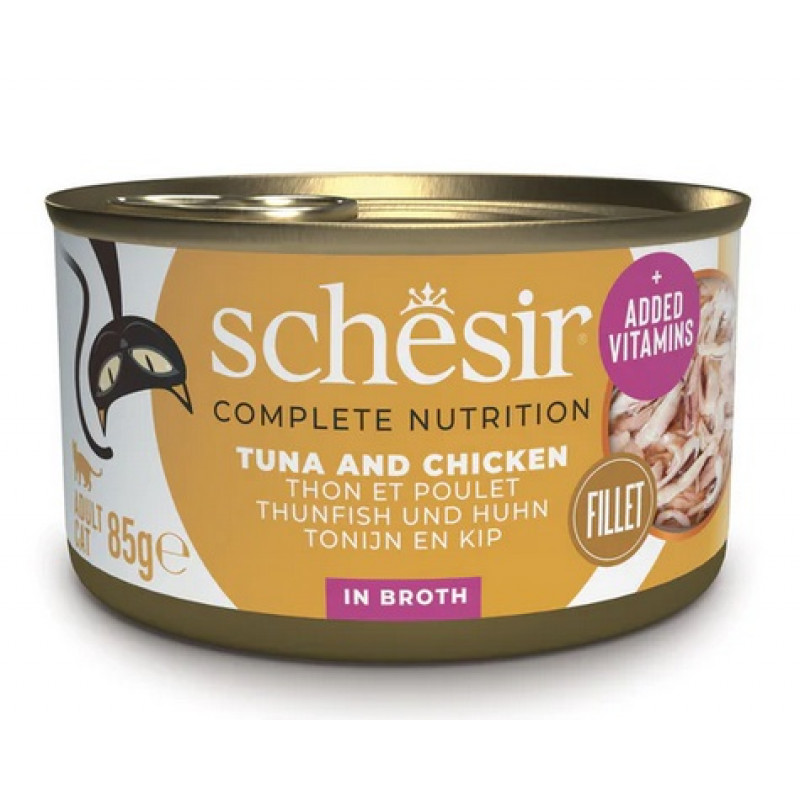 Schesir Cat with Tuna and Chicken in Broth 85g - pilnvērtīgā barība, tuncis un vista buljonā